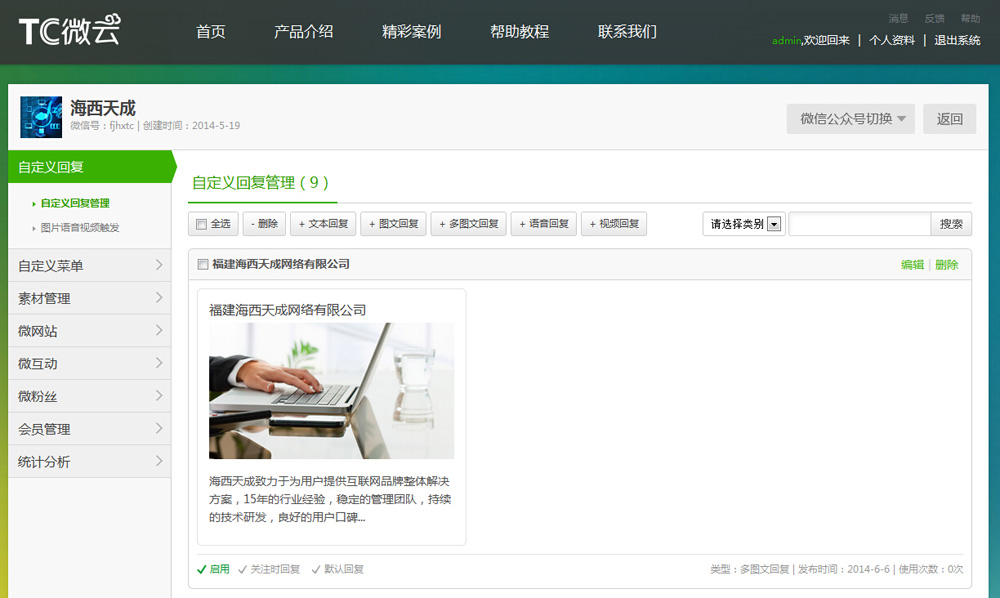 TC微云(天成微信營銷管理平臺)是我司自主研發(fā)的微信管理平臺,平臺應(yīng)用功能經(jīng)我司技術(shù)團(tuán)體進(jìn)行多次升級,目前完全滿足不同行業(yè)客戶的需求。