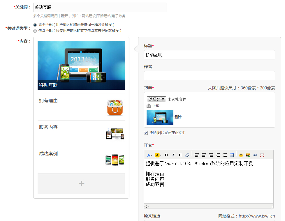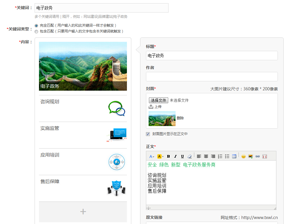 TC微云的特性,“穩(wěn)定、靈活、易用、可擴(kuò)展、安全”等優(yōu)勢,現(xiàn)系統(tǒng)功能已成功集成到“Tcms網(wǎng)站內(nèi)容管理系統(tǒng)”中,用戶只需在門戶網(wǎng)站后臺上既可以管理微信后臺,從而大大增加了管理的便捷性。