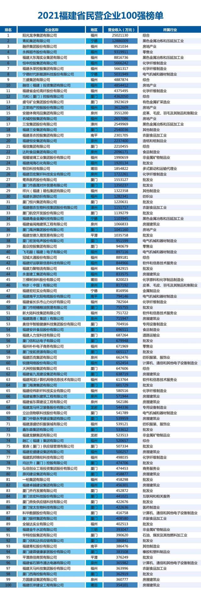 10月15日,福建省工商聯(lián)在三明發(fā)布“2021福建省民營企業(yè)100強(qiáng)”“2021福建省創(chuàng)新型民營企業(yè)100強(qiáng)”“2021福建省民營企業(yè)制造業(yè)50強(qiáng)”榜單,同時發(fā)布《2021福建省民營企業(yè)100強(qiáng)分析報告》《2021福建省民營企業(yè)社會責(zé)任報告》。報告顯示,福建省民營經(jīng)濟(jì)高質(zhì)量發(fā)展成色明顯,成為經(jīng)濟(jì)社會發(fā)展的重要力量和創(chuàng)造社會財富的重要來源。