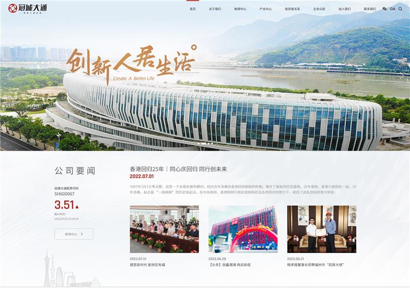 從前期項目需求對接到與海西天成再次達成合作,大大小小會議溝通了多次,最終雙方達成共識,本次冠城大通官網(wǎng)升級是品牌與產(chǎn)業(yè)相結(jié)合的展示,在突出視覺的同時要展示不同業(yè)務(wù)板塊內(nèi)容以及上市企業(yè)特性,經(jīng)過多輪方案溝通與設(shè)計修改,從方案規(guī)劃到項目實施歷時2個多月的時間完成。下面我們走進冠城大通官網(wǎng),共同欣賞全新品牌官網(wǎng)帶來的極致感官盛宴。